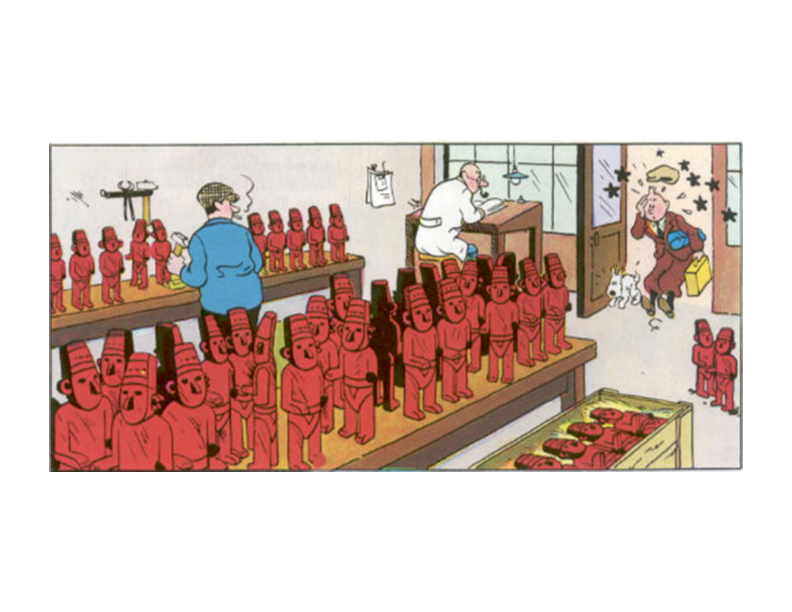 “In June 1979 a major exhibition, which would later be hosted in other venues, was inaugurated at the Palais des Beaux-Arts in Brussels. Hergé was not involved in the detail of the exhibition but the creators explained that the purpose was to put some of the objects that Tintin comes across in his adventures alongside the real objects that inspired them. On the poster he created for the exhibition Hergé drew his main characters in the middle of an imaginary display, the stuff of dreams for Tintin fans and collectors.” Taken from Chronologie d’une œuvre – volume 7.