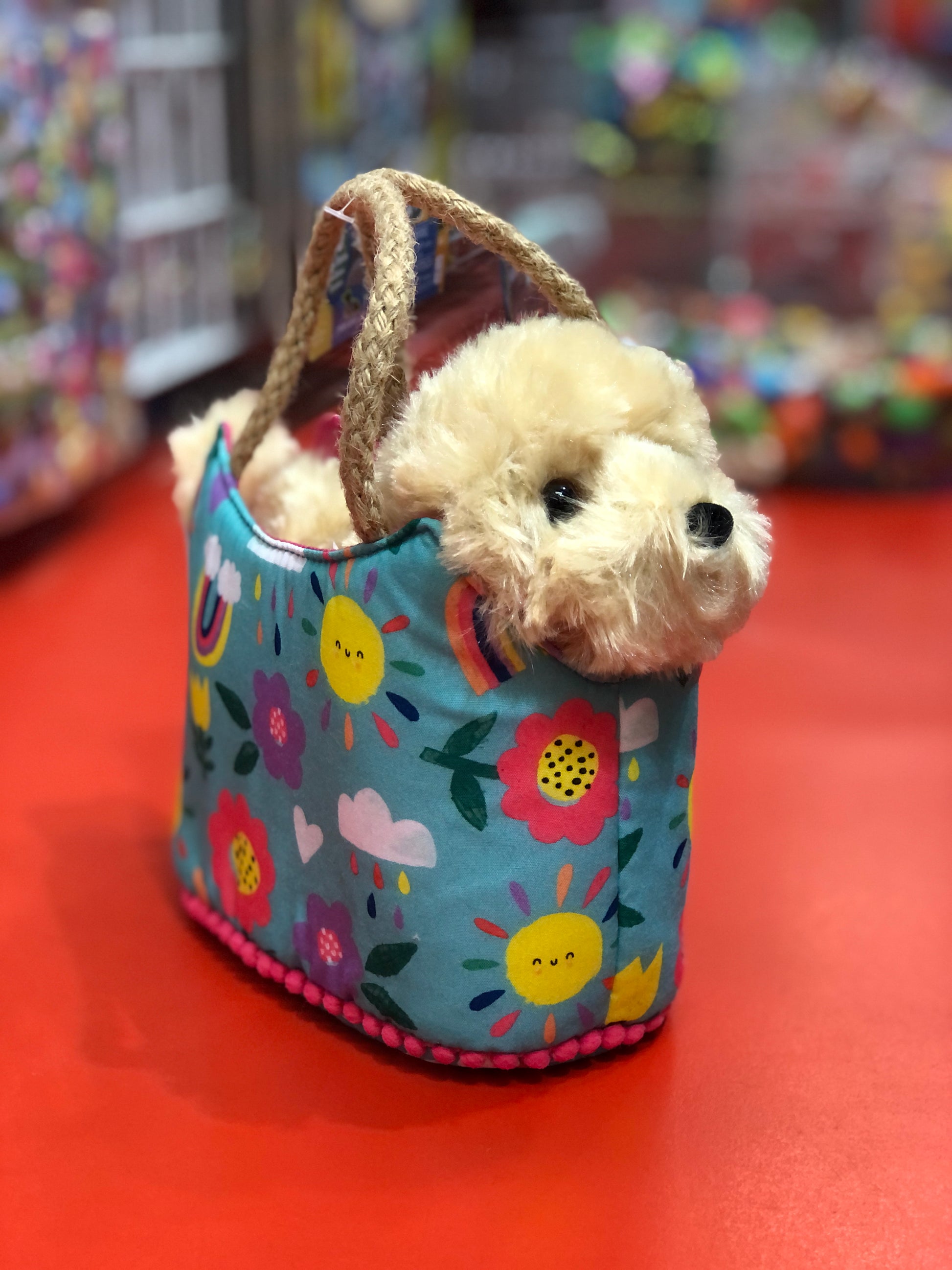 Rain or shine, any day can be a happy day if you make it so! Douglas' Happy Day Sassy Pet Sak features a vibrant print of sunshines, rain clouds, flowers, and rainbows against a bright blue background.
