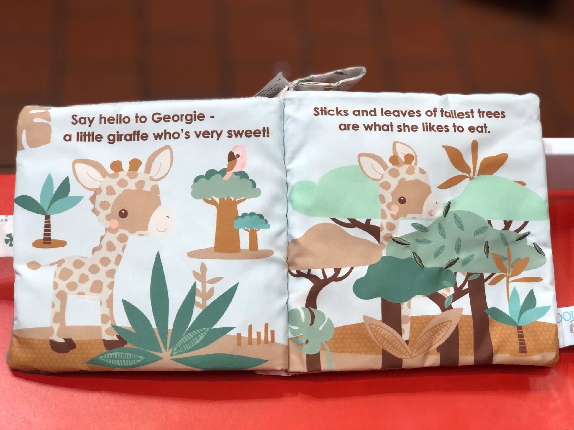 There’s so much do see and do on the African savannah and baby can join Georgie the Giraffe on her adventures with this soft activity book. Release the hook and loop closure and follow the story to discover what Georgie likes to eat and what games she likes to play!