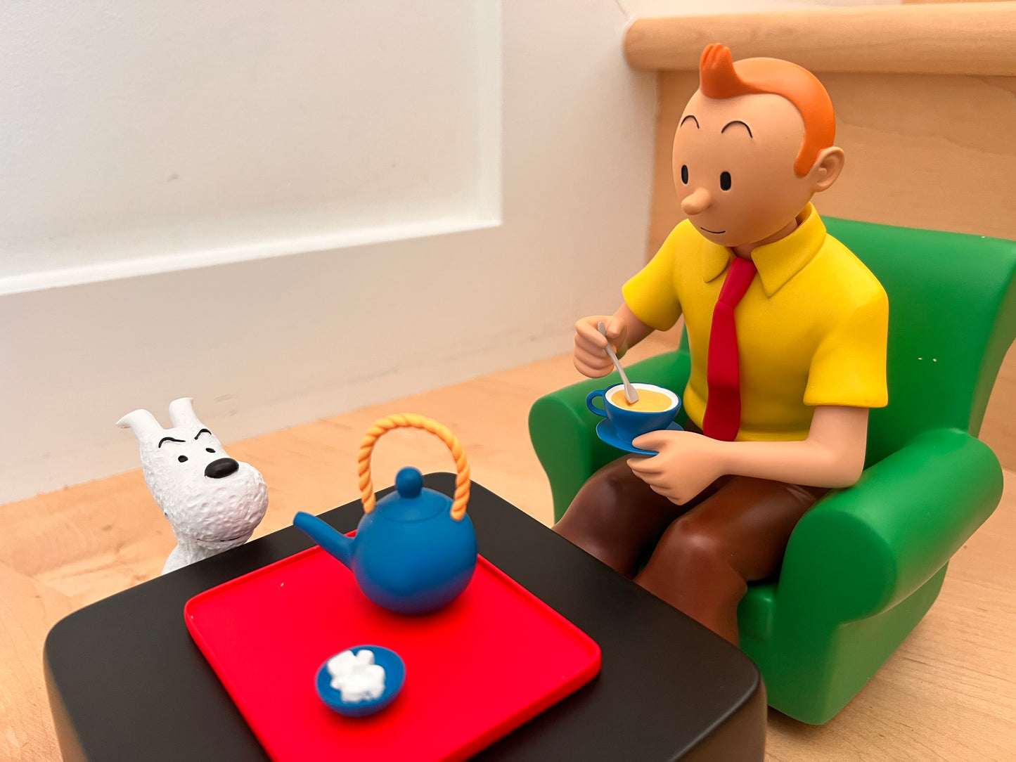 Adapted from a panel from page 9 of the album, the 3D representation makes us relive this mythical moment from The Adventures of Tintin where the hero, seated in a comfortable green armchair, yellow shirt and red tie, is preparing to taste the delicate beverage that has just been served to him, under the interested eye of Snowy.
